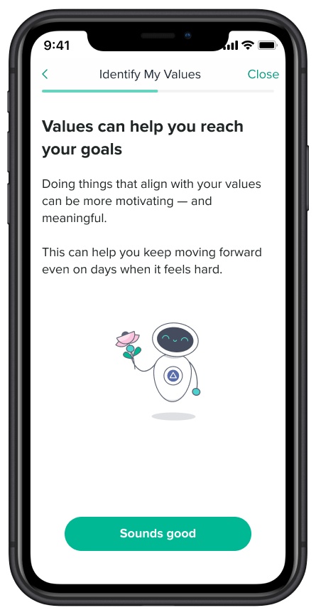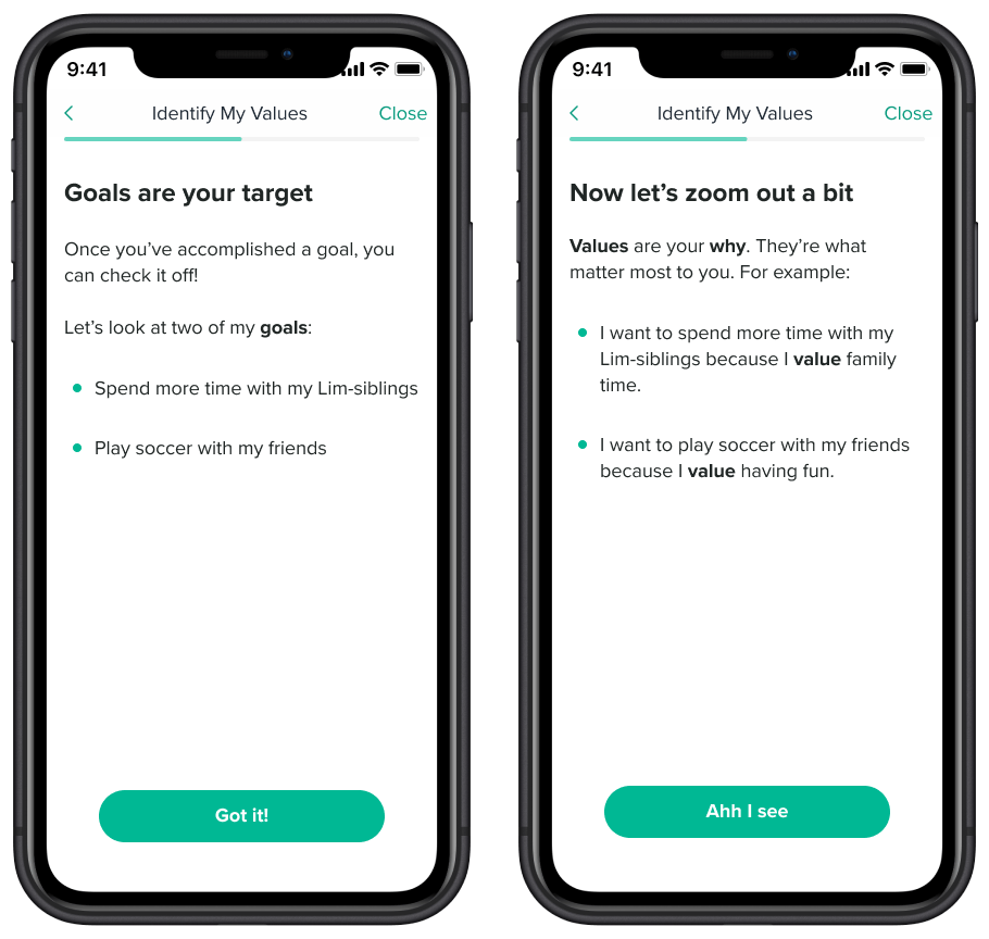 The solution: After reviewing a few potential solutions internally, we determined that the best fit would be to resurface goals in Level 2 of the program where the concept of ‘values’ are also introduced to the user. We made the decision to teach the user about goals from the perspective of the program’s guide, Limbot. This is a method utilized at other stages in the program that has tested well with users and made it easier to blend the new content in with the existing.