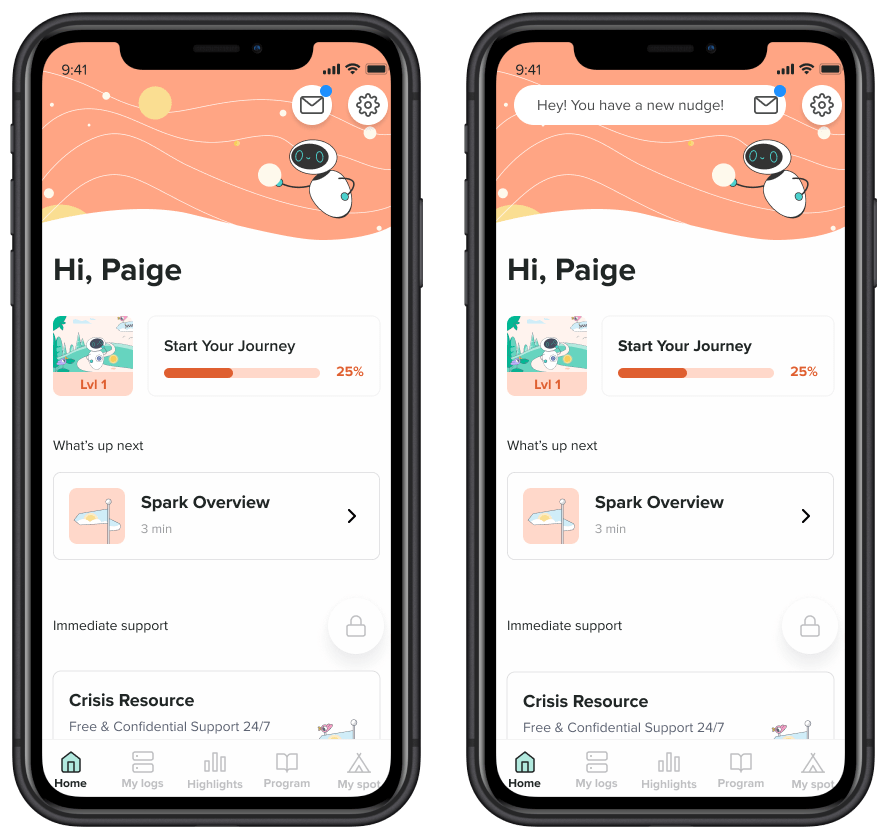 - Nudges: A “nudge” is a pre-written message that a provider can send from the Provider Portal. Depending on the user’s progress in the app and/or their level of inactivity relevant nudges appear on the provider’s portal. They can optionally select a pre-written nudge to send to the user. If their provider sends a nudge, the user receives a push notification prompting them to check the Spark app to view the message. Nudges can be viewed from a message center in the app.